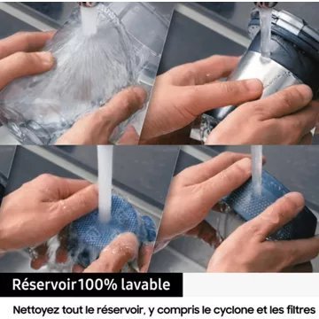 - Technologie d’aspiration : Multi-cyclonique : cette aspiration permet de traiter les grosses poussières ainsi que les particules fines grâce à ses multiples cyclones. Elle offre une force d’aspiration intense pendant toute la durée du nettoyage