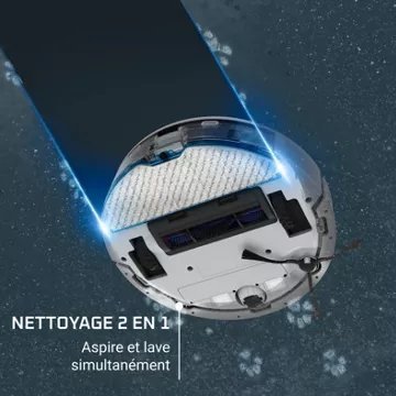 • 2‑en‑1 aspirateur laveur robot : combine aspiration et nettoyage humide grâce au système Smart Aqua Power (réservoir électronique).