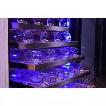 - Type de porte : vitrée, permet de visualiser facilement les bouteilles sans avoir à ouvrir la porte, ce qui réduit la circulation de l’air dans la cave et donc la variation de la température. Le traitement anti-uv protège le contenu.