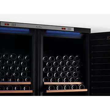 - Type de porte : vitrée, permet de visualiser facilement les bouteilles sans avoir à ouvrir la porte, ce qui réduit la circulation de l’air dans la cave et donc la variation de la température. Le traitement anti-uv protège le contenu.