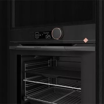 Le DE DIETRICH DOP4546HT se distingue par son design Heritage noir et cuivre, apportant une touche d’élégance à toute cuisine. L’écran LCD blanc facilite la programmation, tandis que la porte abattante Soft Close et la contre porte plein verre déclipsable offrent confort et sécurité d’utilisation.