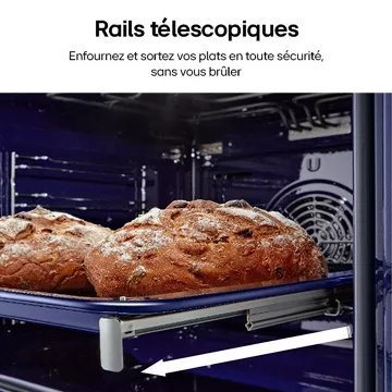 - Rails téléscopiques : ils permettent d’accéder à vos plats en les faisant coulisser en dehors de l’enceinte de cuisson en évitant les risques de basculement. Vous pourrez arroser confortablement votre rôti ou retourner facilement vos plats sans risque de brûlure.