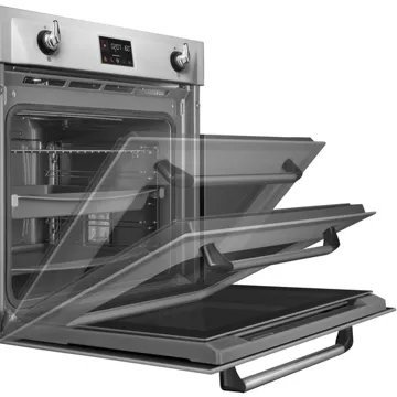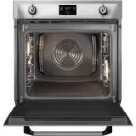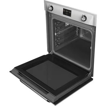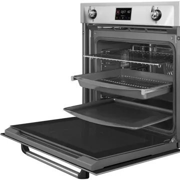 Le four encastrable SMEG SOP6902S2PX, avec son esthétique Victoria et sa finition inox anti-trace, s’intègre parfaitement dans les cuisines modernes tout en apportant une touche d’élégance intemporelle. Doté d’une porte bombée avec cadre et d’une poignée Victoria effet inox, ce modèle est un véritable objet de design. L’afficheur EvoScreen et les commandes manettes associées à des touches tactiles offrent une utilisation intuitive et une expérience utilisateur optimisée. La technologie d’éclairage halogène assure une visibilité parfaite de l’intérieur de la cavité de 68 litres, tandis que la porte froide avec quadruple vitrage garantit sécurité et confort d’utilisation.