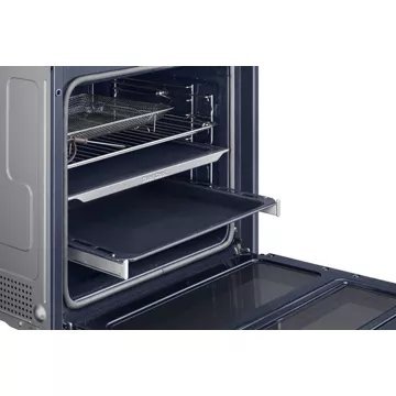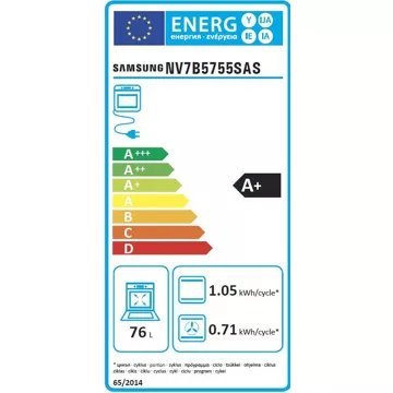 La technologie Dual Cook Flex™ du four Samsung NV7B5755SAS divise l’intérieur en 2 cavités indépendantes, accessibles par un système d’ouverture à deux portes. Vous pourrez alors cuire deux plats simultanément avec des températures et des temps de cuisson différents (mode Twin Convection™). Pour utiliser le grand espace 76 litres de ce four pyrolyse et cuisiner des plats volumineux, retirez tout simplement le séparateur de cavité. En plus, il contient un rail télescopique qui vous permet de charger, badigeonner, tourner, assaisonner et décharger vos plats sans risquer de vous brûler. Sa consommation énergétique ? Ce four Samsung présente une efficacité A+.