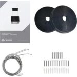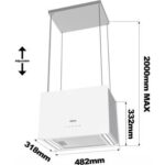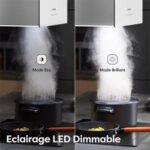 Fixation : suspendue au plafond via une platine et câbles d’acier réglables, hauteur recommandée de 65–75 cm au-dessus du plan de cuisson (75 cm pour gaz, 65 cm pour électrique)
