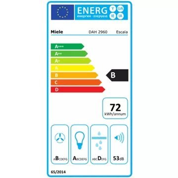 La hotte murale MIELE DAH 2960 GRGR Escala se distingue par son design moderne et sa finition en gris graphite, offrant une vue dégagée grâce à son déflecteur en verre de largeur 898 mm. Elle s’intègre parfaitement dans toute cuisine contemporaine tout en assurant une efficacité redoutable avec ses trois niveaux de puissance et un mode Booster, capable d’atteindre une puissance de ventilation de 675 m³/h. Sa classe d’efficacité énergétique B garantit une consommation maîtrisée, tandis que son éclairage LED procure une lumière agréable de 300 lx à une température de couleur de 3500 Kelvin, contribuant à une atmosphère chaleureuse et fonctionnelle.