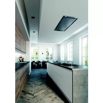 - Type de hotte : plafond, offre un design contemporain et dégagé, libérant l’espace mural. Elle assure une capture optimale des fumées et odeurs de cuisson, tout en créant une ambiance moderne et sophistiquée dans la cuisine, idéale pour un style de vie moderne et élégant.