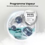 - Lavage vapeur en profondeur : oui, idéal pour une hygiène parfaite et les personnes allergiques, élimine jusqu’à 99,9% des bactéries de votre linge grâce à la combinaison de la vapeur et du lavage à haute température.