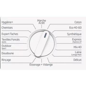 - Programmes : charge mixte, chemise, coton, éco, jeans, laine, sport, synthétique