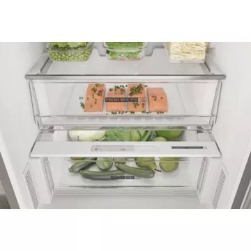 Le réfrigérateur combiné Whirlpool W7X92IOX se distingue par sa classe d’efficacité énergétique E, garantissant une consommation maîtrisée de 254 kWh/an. Doté d’une capacité XXL de 367 litres, il offre un espace de conservation optimal avec un volume utile de 263 litres pour le réfrigérateur et de 104 litres pour le congélateur. La technologie Total No Frost prévient la formation de givre et assure une température constante, tandis que la fonction 6ème Sens optimise la durée de conservation des aliments. L’éclairage intérieur LED, les clayettes en verre ajustables et la FreshBox+ avec slider pour le contrôle de l’humidité complètent l’équipement de ce modèle, rendant l’utilisation quotidienne à la fois pratique et économique.