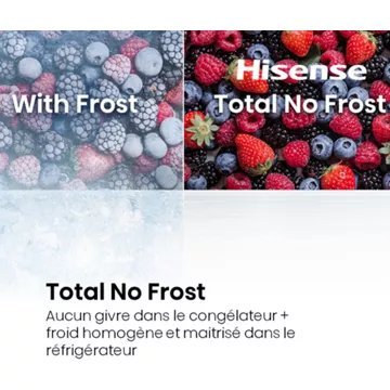 des aliments. Le niveau sonore de 37 dB garantit un fonctionnement discret. En outre, ce modèle est équipé d’une connectivité wifi via l’App ConnectLife, permettant de le contrôler à distance. La présence d’une alarme, d’une autonomie de 14h en cas de coupure de courant, et d’une fabrique de glaçons automatique dans un bac dédié complètent les atouts de ce réfrigérateur Hisense, faisant de lui un choix de référence pour les foyers recherchant capacité et technologie avancée.