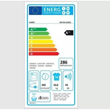 Vous souhaitez sécher votre linge sans vous ruiner ? Le sèche-linge à pompe à chaleur HAIER HD100-A2939-FR est fait pour vous ! La technologie de la pompe à chaleur permet de réduire la consommation d’énergie jusqu’à 50 % par rapport à un sèche-linge ordinaire (classe énergétique A++). La consommation moyenne par cycle pour une charge pleine de 10 kg est de 2,35 kWh.