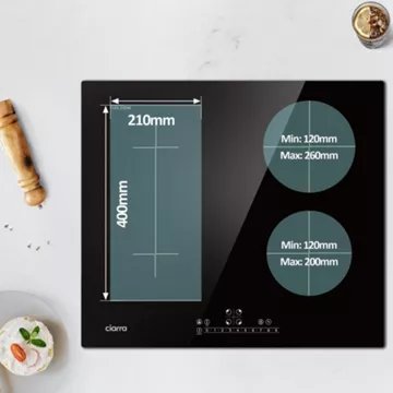 - Zone de température modulable : permet de changer la puissance de chauffe automatiquement en faisant glisser votre casserolerie sur la zone flexible de votre table de cuisson.