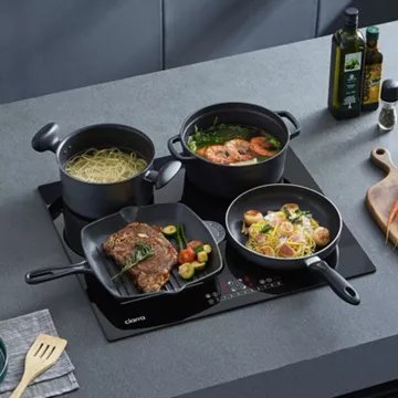 Haute Efficacité d’énergie – Les casseroles contactent directement dans la zone de cuisson vitrocéramiqu, rendant une éfficacité d’énergie max jusqu’à 90%, réduisent les pertes de chaleurs pendant la cuisson.