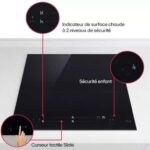 - Sécurités : arrêt automatique, coupure en cas de débordement, anti surchauffe, verrouillage du clavier, témoin de chaleur résiduelle, détection d’absence de récipient, détection de petits objets, témoin de mise sous tension