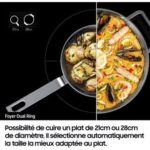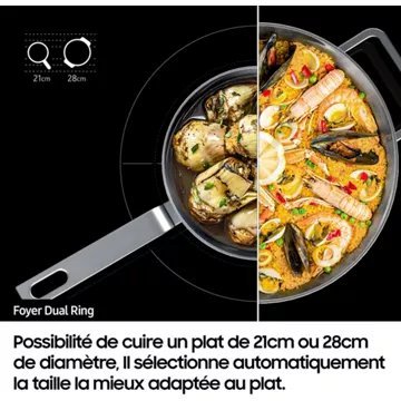 - Foyer modulable : zone flexible étendue, permet d’avoir une homogénéité de la chaleur sur toute la zone et s’adapte automatiquement à la taille de votre casserolerie, même les bien plus grandes grace à l’extension de la zone de cuisson.